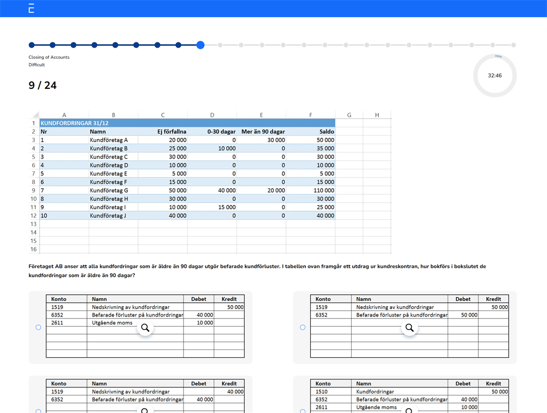Testing of both basic bookkeeping, e.g. common customer and supplier invoices, representation and receipts, correction of a recorded transaction, credit invoices etc, to more advanced accounting - e.g. salaries, accrued vacation pay, invoices in foreign currency, tax revenues etc.