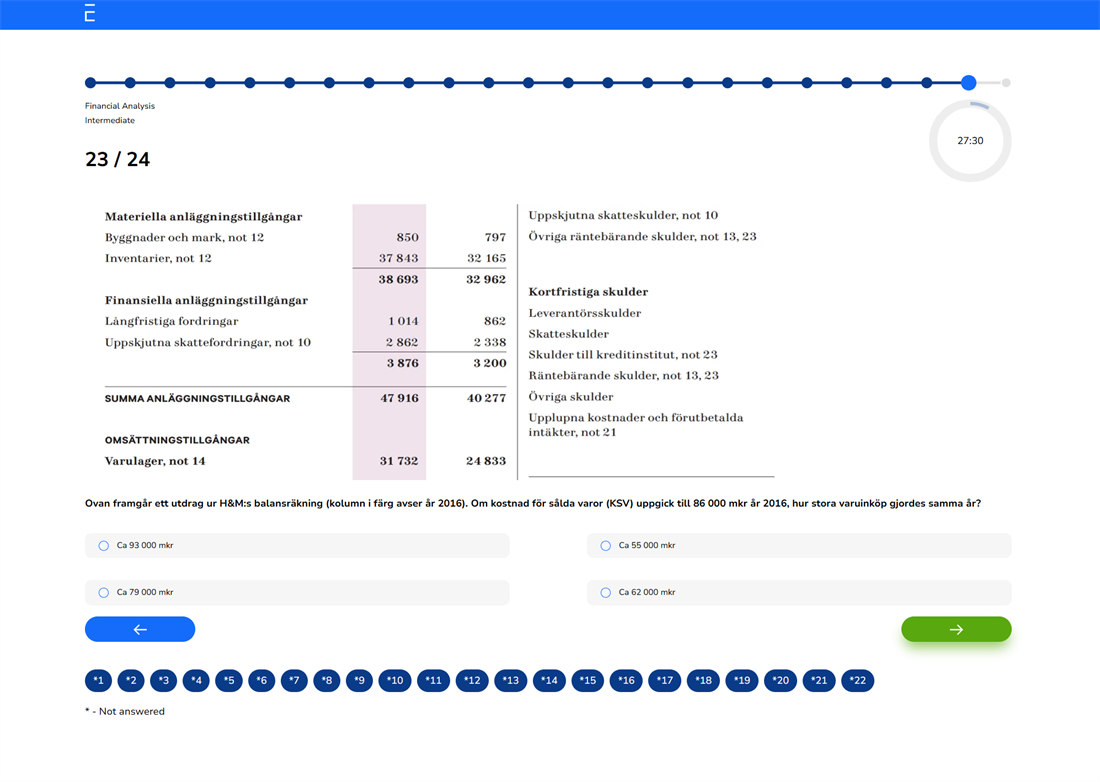 Test in Swedish on Swedish GAAP, distinguishing candidates managing Closing of Accounts and Reporting from those with strong Financial Analysis skills and deep knowledge of Income Statements and Balance Sheets.