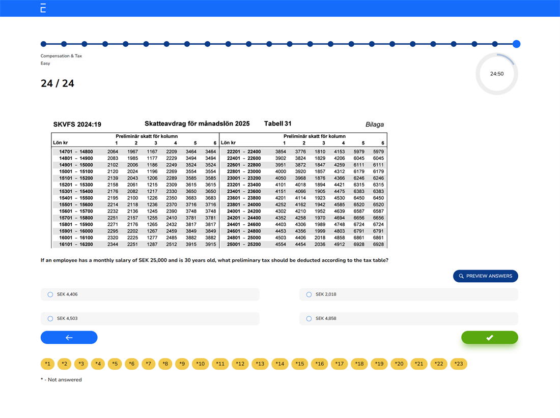 A total of 24 questions are generated and must be answered within 30 minutes. During the test, candidates can skip questions and come back to them later. They also have access to a timer and a progress indicator. The test will automatically close when the maximum time limit is reached.